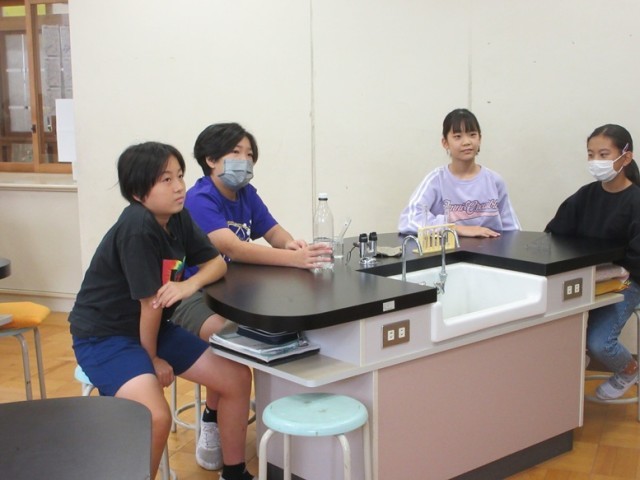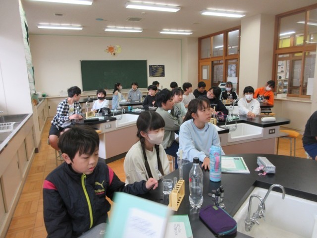 2組は、理科「水溶液の性質」の学習です。今日は、炭酸水の性質について、石灰水を使った実験をしました。石灰水を使うということは・・・。班で協力して実験を行いました。