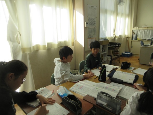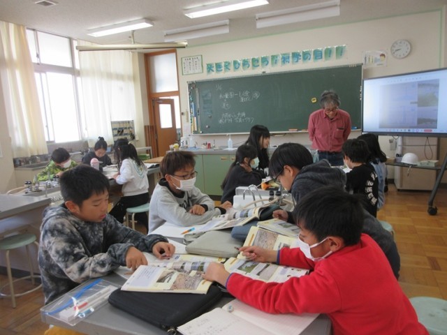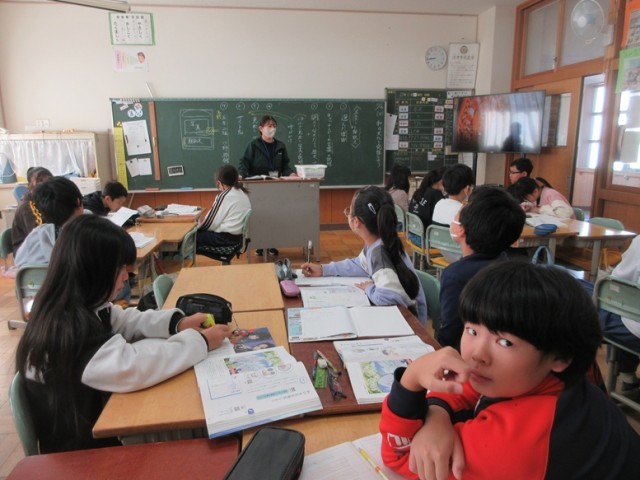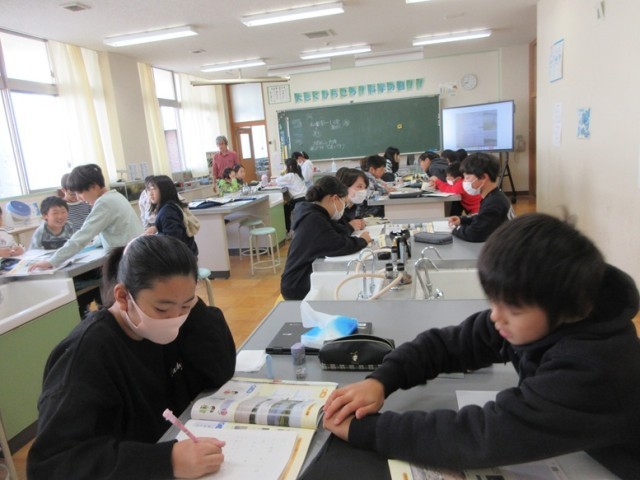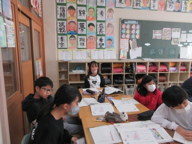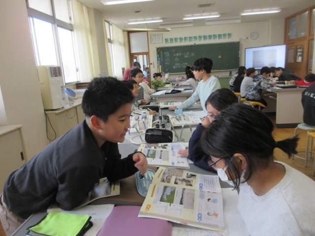 5年1組は、理科「流れる水のはたらき」の学習です。大雨が降った後、どのようなことが起こるのかを友達と話し合っています。自分の意見を積極的に伝え、友達の話にもしっかり耳を傾けています。
