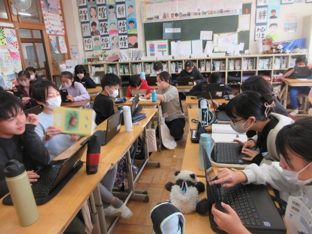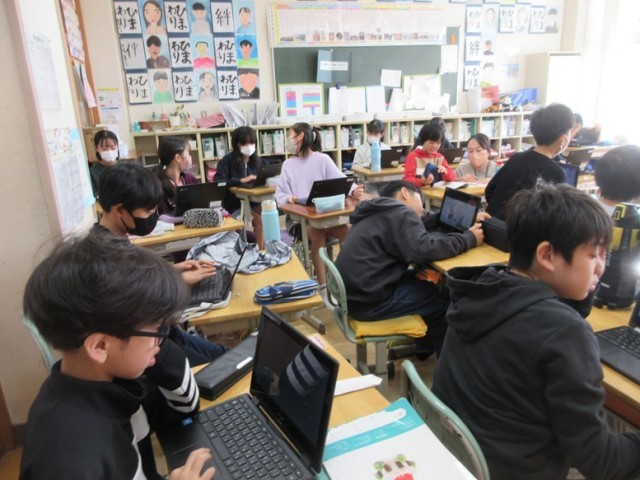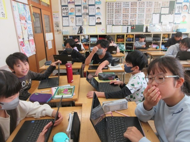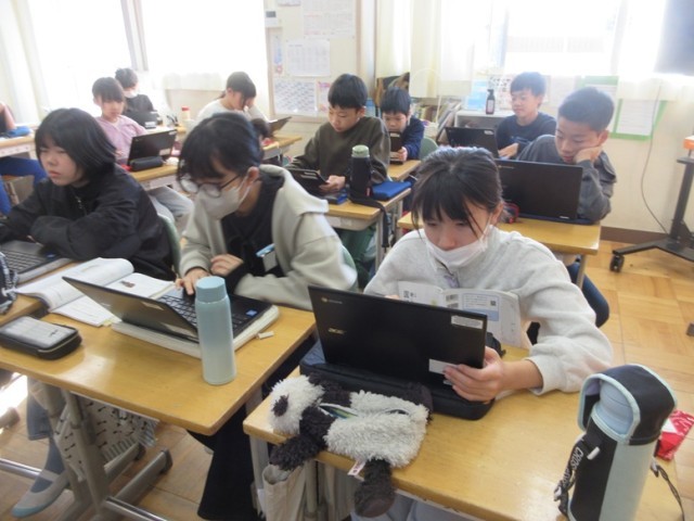 6年1組は、国語「プラスチックが生き物に及ぼす影響」について、Chromebookを使って調べ学習をしています。とても小さなマイクロプラスチックは、今、とても大きな問題になっていますね。