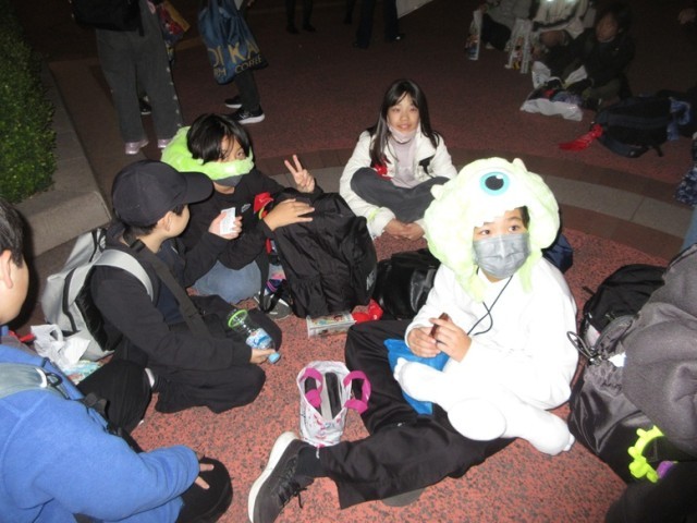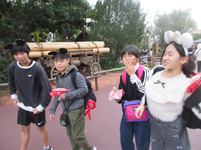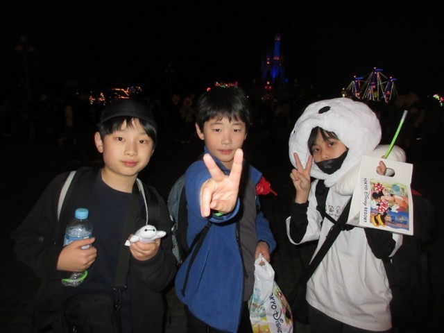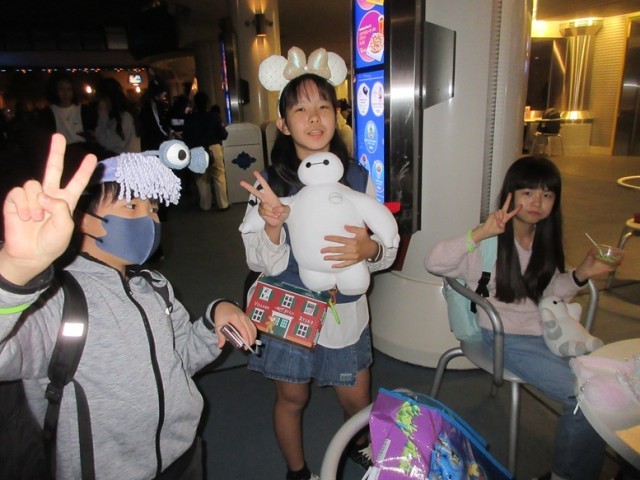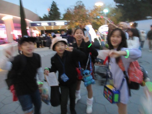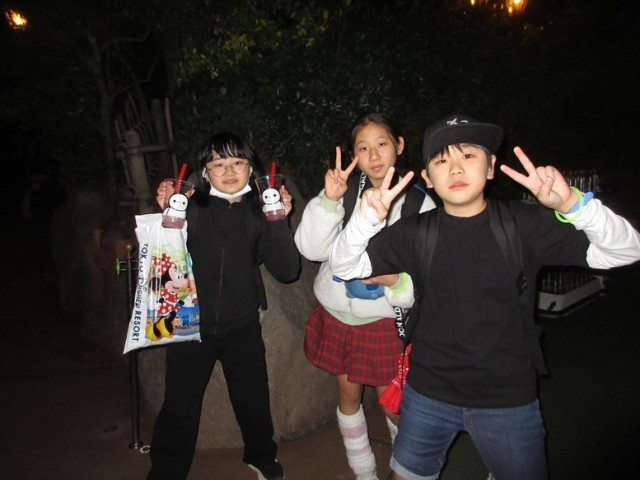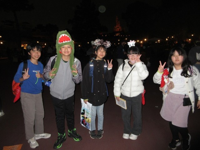 暗くなると、四小カラーの蛍光リングが目印になりました。みんな、大きな袋や被り物などたくさんのおみやげを手にしていました。「弟にこれ、妹にこれをおみやげに買ったんだ」「お母さんにはこれ」などなど、家族のことを考えてプレゼントを購入する子も多くいました。「明日の分もお小遣い残してあるよ」「だいぶ使ったけど、明日はがまんするんだ」などなどお小遣いの使い道も自分で考えています。