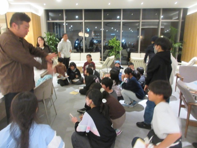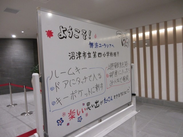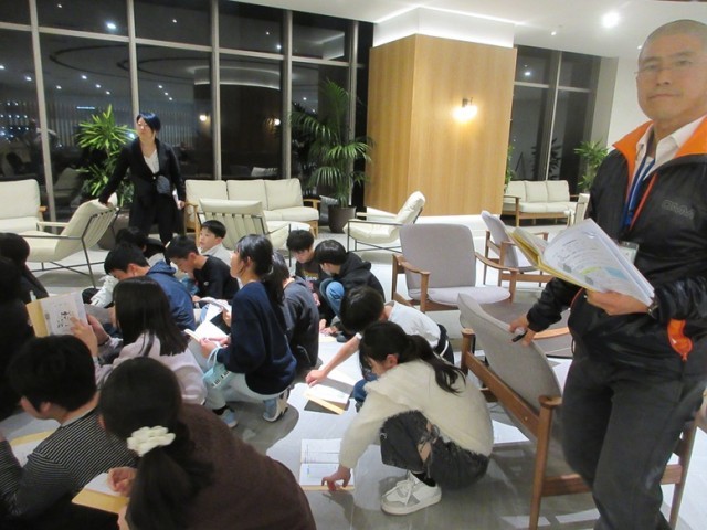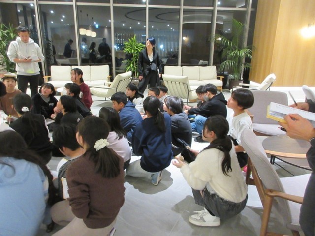 ホテルに着くと、ホテルの方からの手書きのウェルカムホワイトボードがみんなを歓迎してくれました。入所のあいさつをして、いったん部屋に入り、班長会議が行われました。