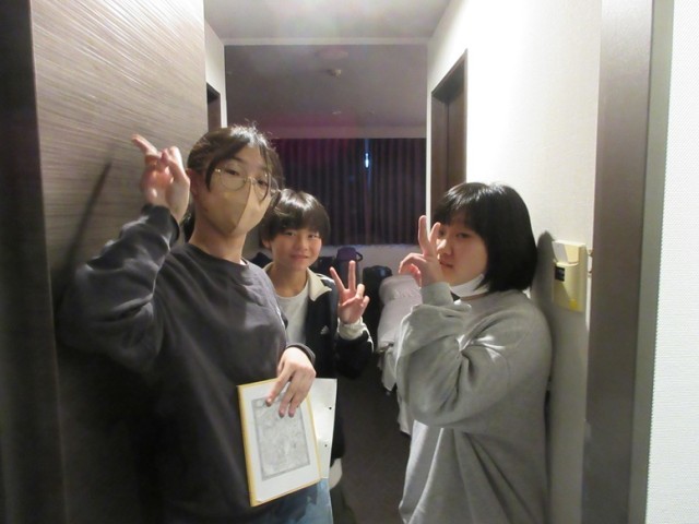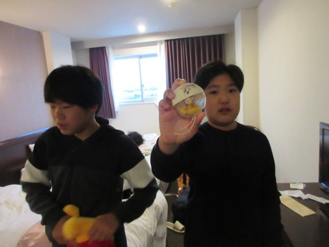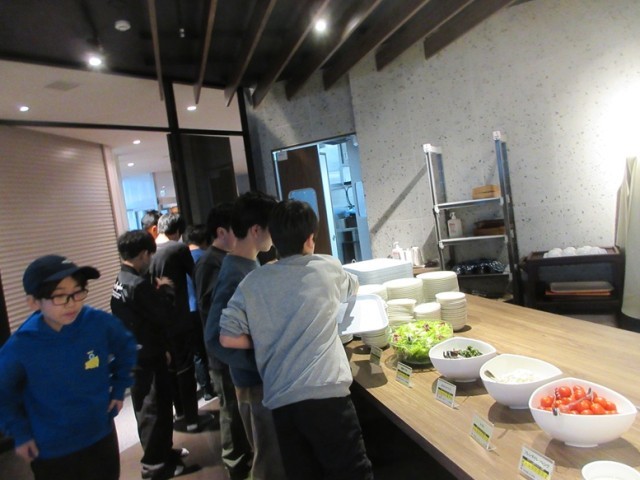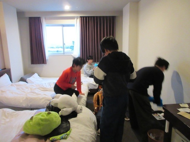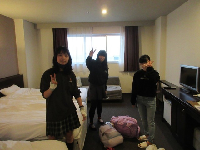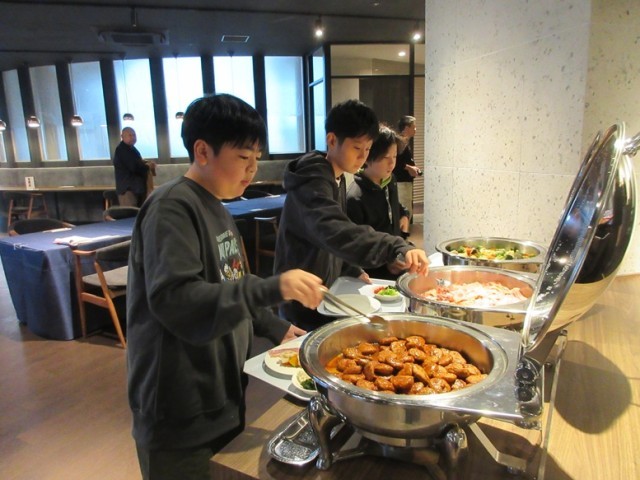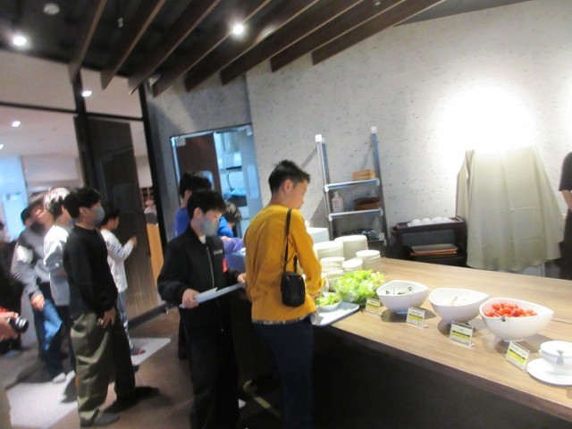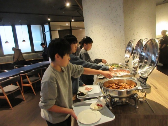 修学旅行2日目の朝です。外は雨が降った様子でしたが、朝6時の段階ではやんでいました。昨日のおみやげでいっぱいになっていた部屋の片づけをして、朝食会場に向かいます。朝食はバイキングです。自分好みに取り分けていきます。どれもとっても美味しそうですね。