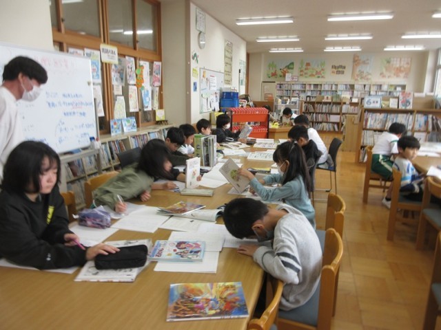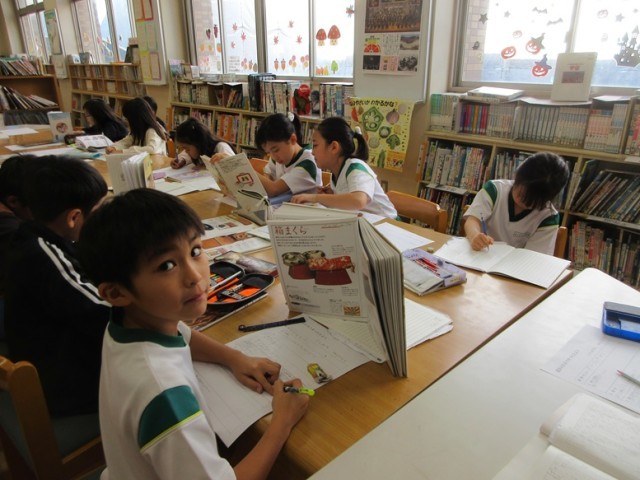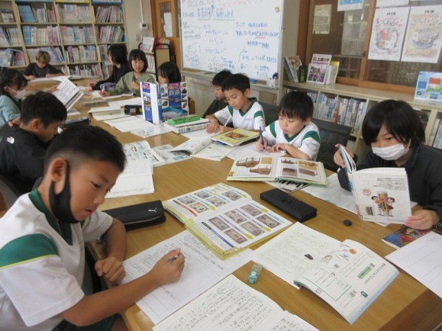 2組は、国語「道具のひみつを伝えよう」の学習で、図書館でそれぞれが伝えたい道具について調べています。プリントにびっしりと書き込んでいる子も多くいました。みんな、頑張っています。