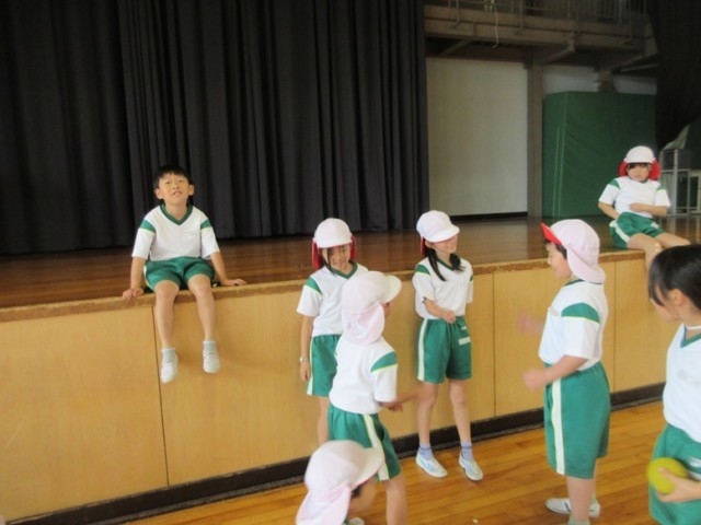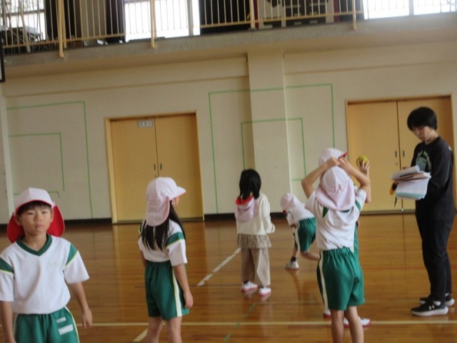 2組は、体育「的当て」です。だんだん力強く投げられるようになってきました。