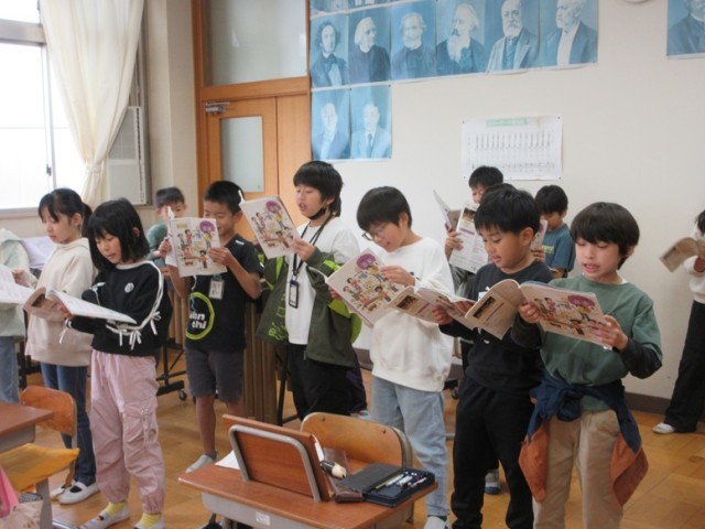 4年1組は、音楽「もみじ」の学習です。音楽室の前後を使って、ソプラノとアルトに分かれて歌います。どちらに引きずられなく、意識しながら自分のパートを気持ちよく歌っていました。その後、徐々に前後の距離を近づけて歌いました。