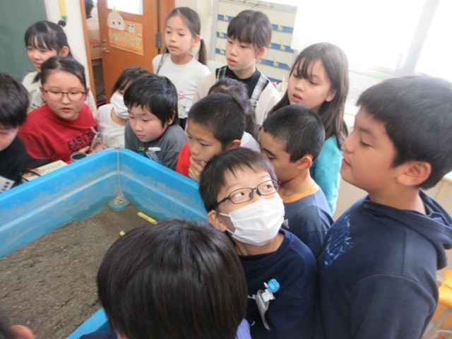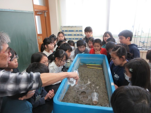 2組は、理科「流れる水のはたらき」の学習です。理科室で、砂や土の坂道を作り、ペットボトルの水を流し、どうなるのかを実験・観察しました。みんなは、どんなことに気がついたかな?