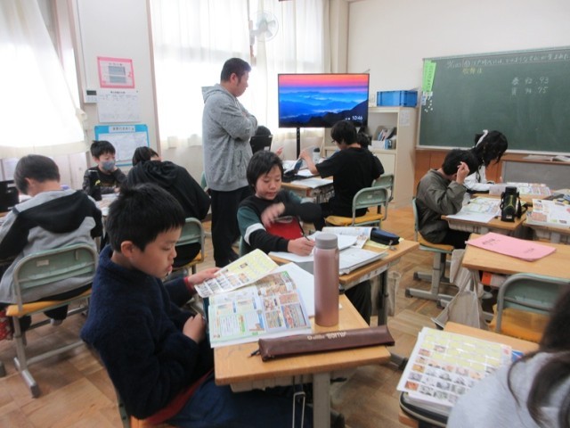 3組は、社会科「江戸時代にはどのような文化が生まれたのか」という学習課題について、資料集を活用して調べています。