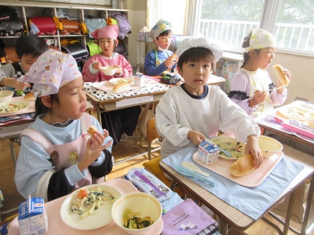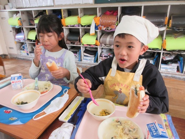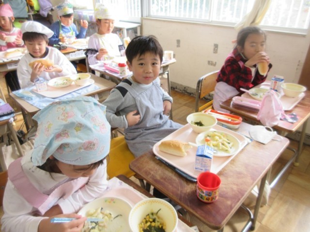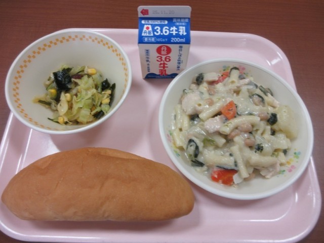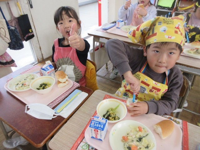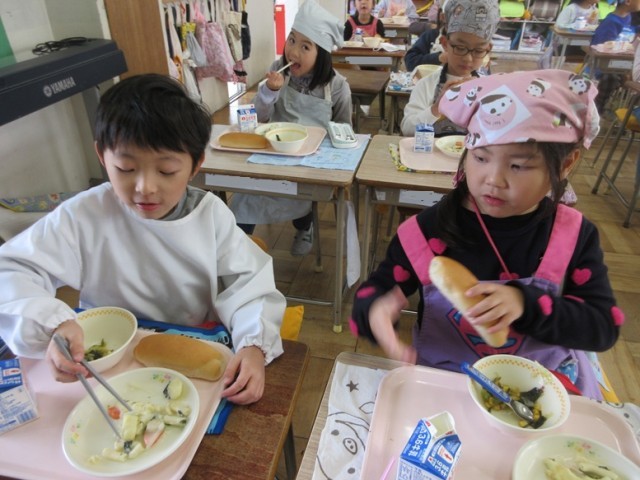 今日の献立は、ロールパン、チキンマカロニグラタン、海藻サラダ、牛乳です。1年生も「グラタンおいし~!」とどの子もおいしそうに給食を食べてます。パンに切れ目を入れてグラタンをはさんで食べる子もいました。海藻サラダもとっても好評でした!