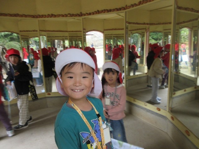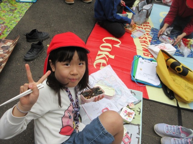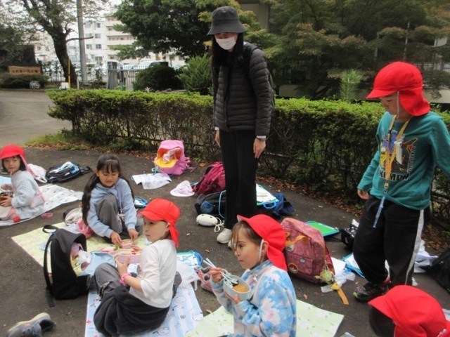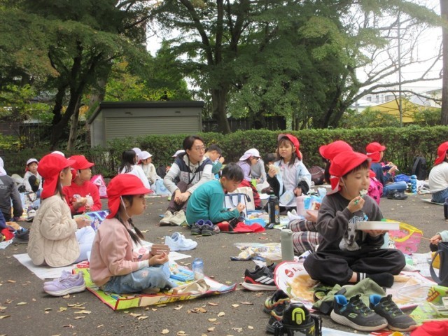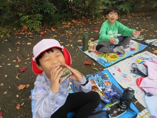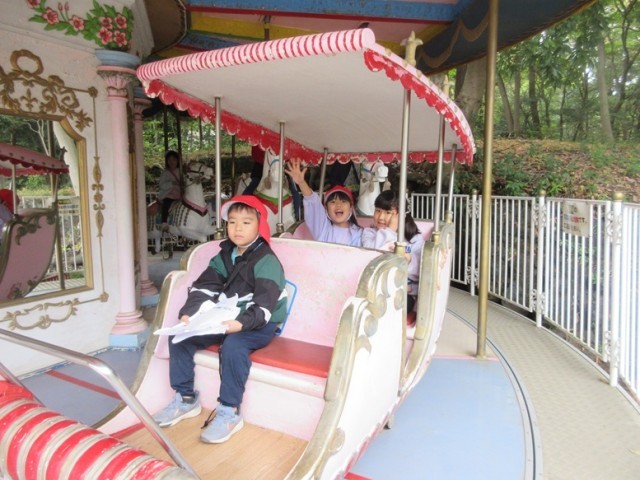お昼は、おいしいお弁当をいただいて大満足です。秋の落ち葉を見つけたり、小さなどんぐりを拾ったり、動物を見たり、乗り物に乗ったりした楽寿園探検も無事に終わりました。