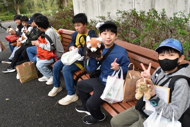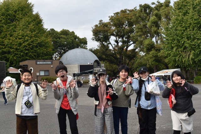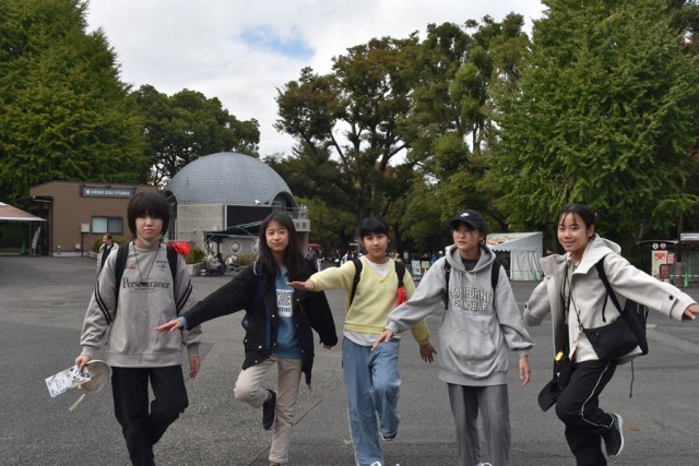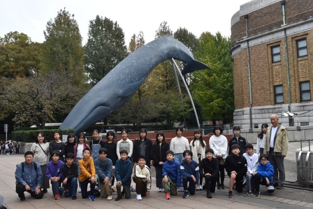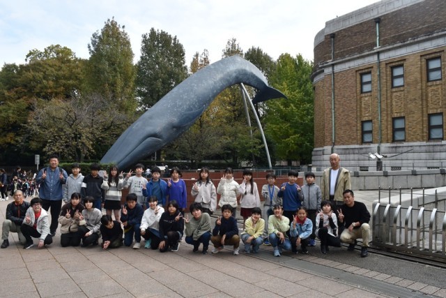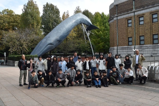 科学博物館の大きなクジラの前でクラスごと記念写真!