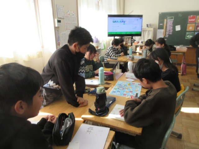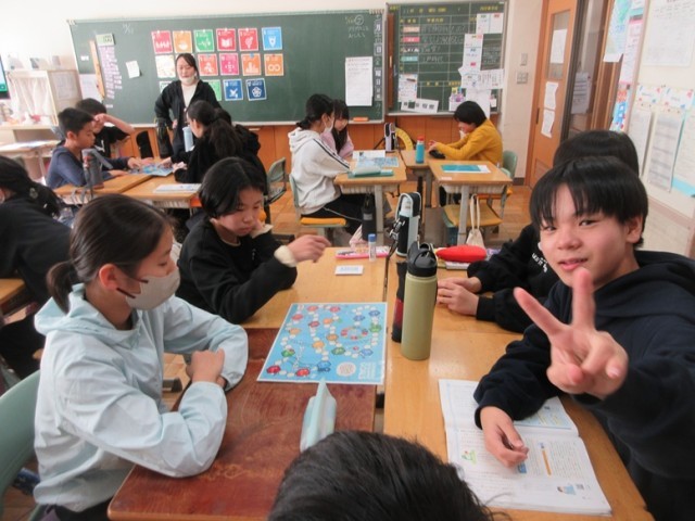6年1組は、国語でSDGsの学習です。楽しく学ぶためにすごろくをやりながら学習します。17の目標のますに止まったらカードを引きます。ちょうど止まることはできたかな?