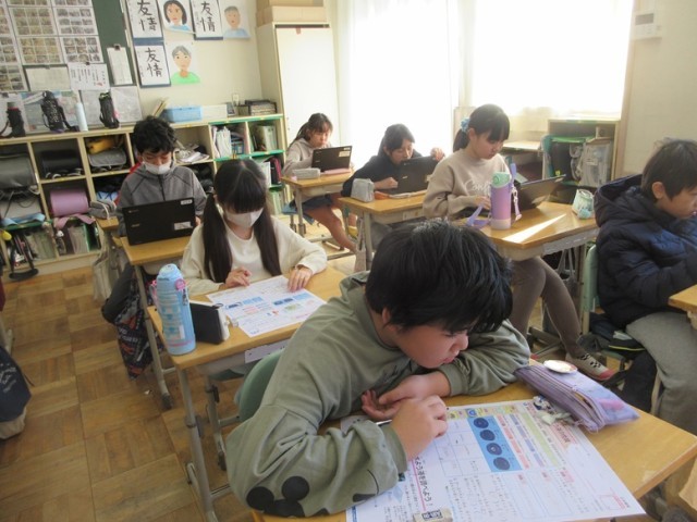 2組は、理科「水溶液の資質」のテストです。これまで学習してきた成果が出せたでしょうか。そういえば、今日は第四中の学期末テストの日かな?もうすぐ中学生になるみんなもテスト対策も身につけていくようになるのですね。