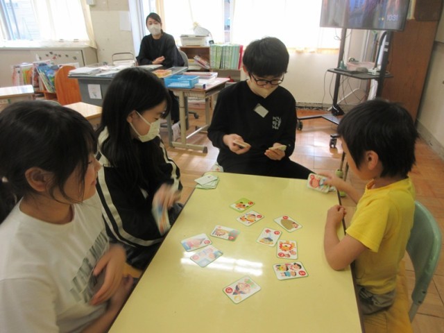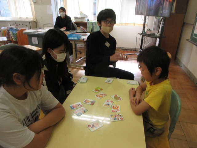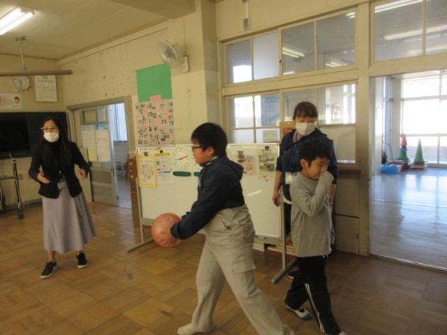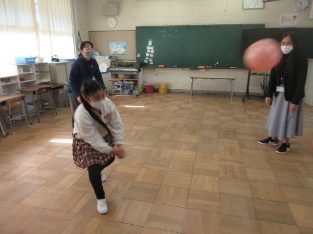 2組は、英語の学習です。バレーボール遊びをしながら、何回続いたかを英語で「ワン、ツー、スリー・・・」とみんなで数えていきます。どの子もハラハラしながら、英語を発音しています。