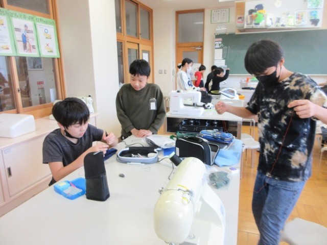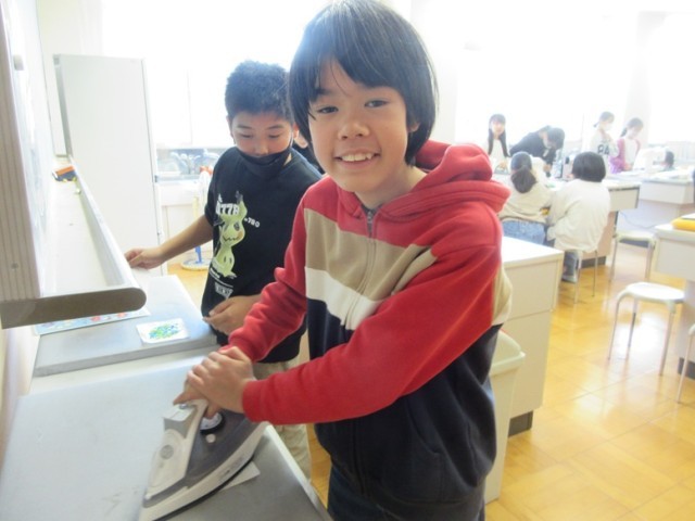 6年1組は、家庭科でお弁当バック作りです。また、ペットボトルのキャップをリサイクルしたキーホルダーも作っています。ミシンやアイロンを駆使して、意欲的に活動しています。