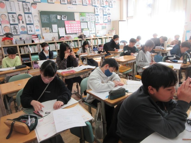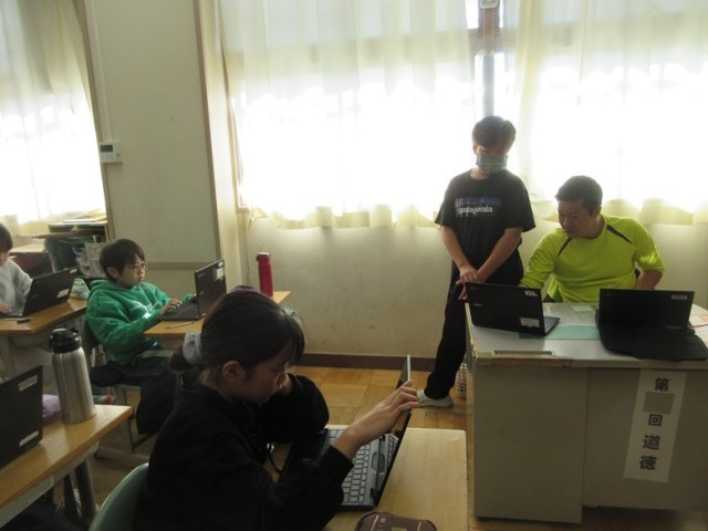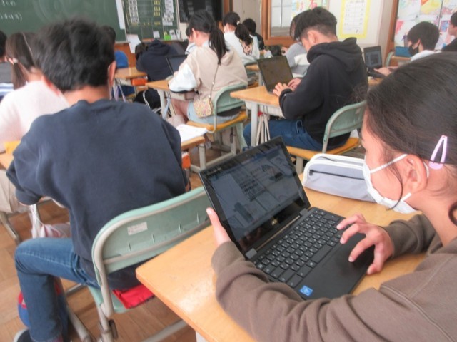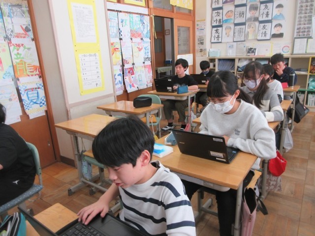2組は、社会科のテストの後、修学旅行のまとめのスライドを作っています。楽しかった思い出がよみがえりますね。