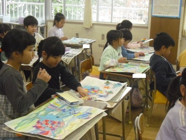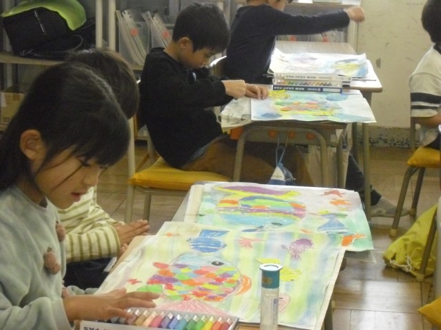 子どもたちからは「さかなはお話しているかもしれないからよ。口から出ている『あわ』を描きたいな」という声が出ました。