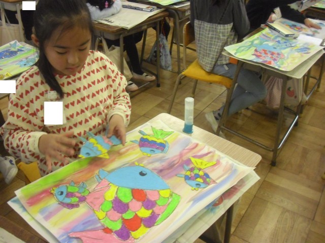 今日は、先日描いた「にじいろのさかな」の絵に付け加えるものを考えました。