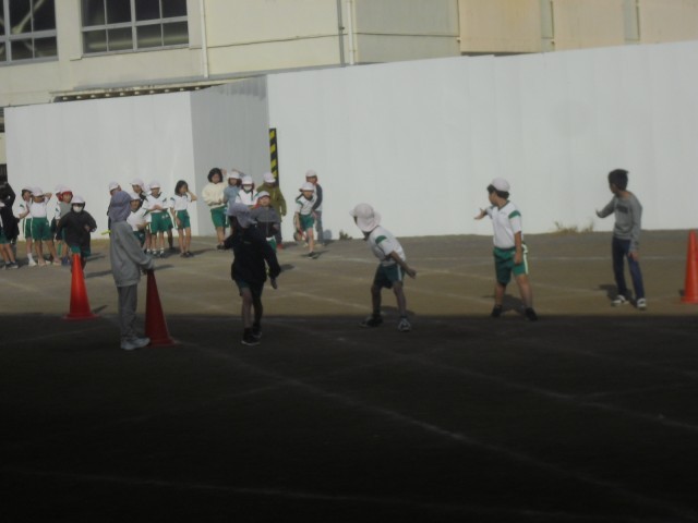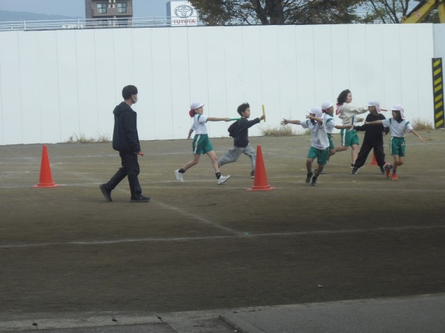 3年生は、体育で「リレー」の学習をしていました。今日はバトンパスの練習をしていました。バトンを渡すタイミングやリードするタイミングを意識しながら練習に取り組んでいました。