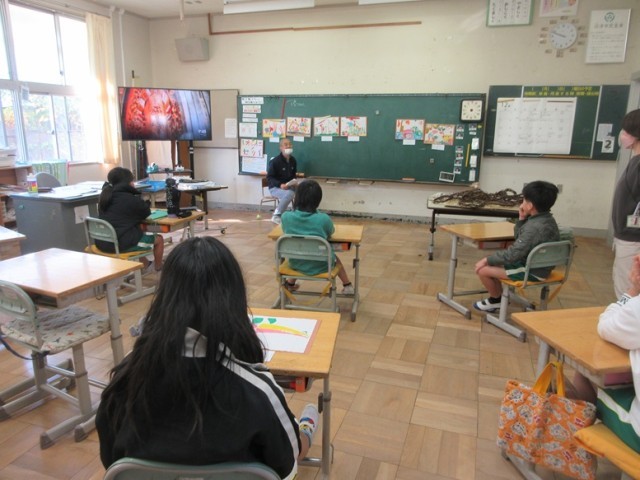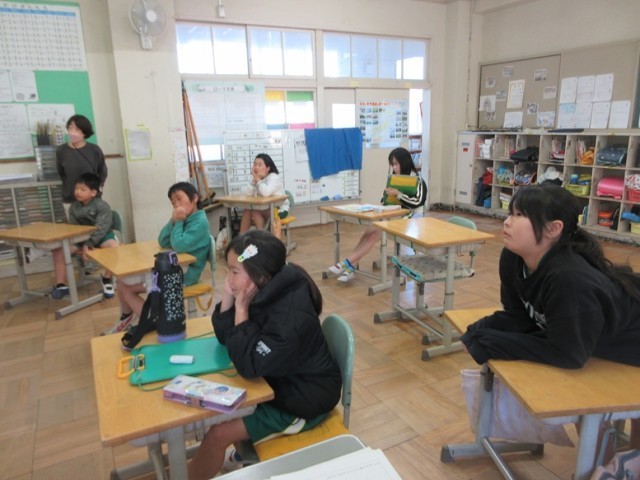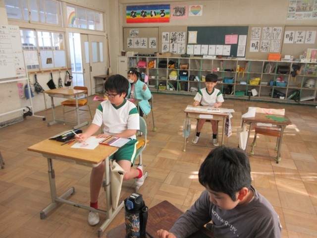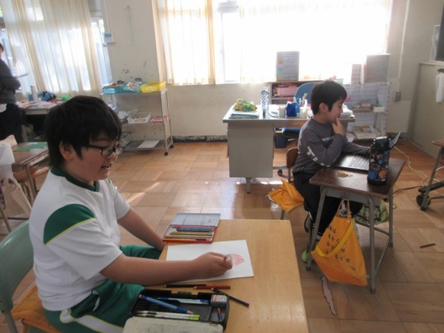 7の1組は、図工「カラー版画」の鑑賞です。「ロブスターに見えておいしそうです」など友達の作品を見ながら素直な感想が出されています。