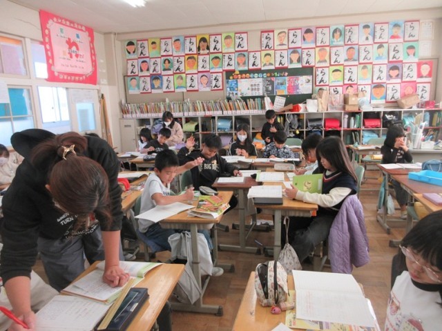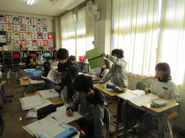 4年1組は、算数「できるようになったこと」、かさ、不等号、単位の換算、小数のたし算、引き算などのまとめです。先生にチェックしてもらっています。