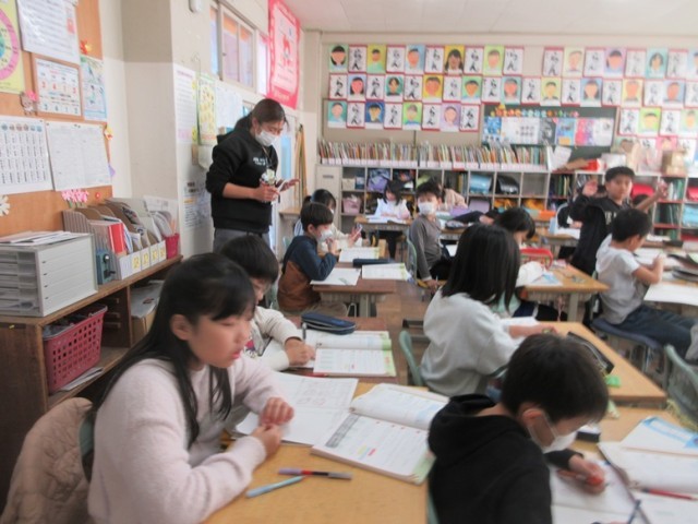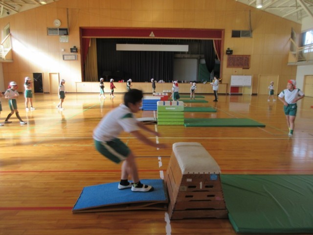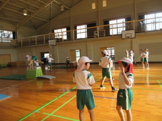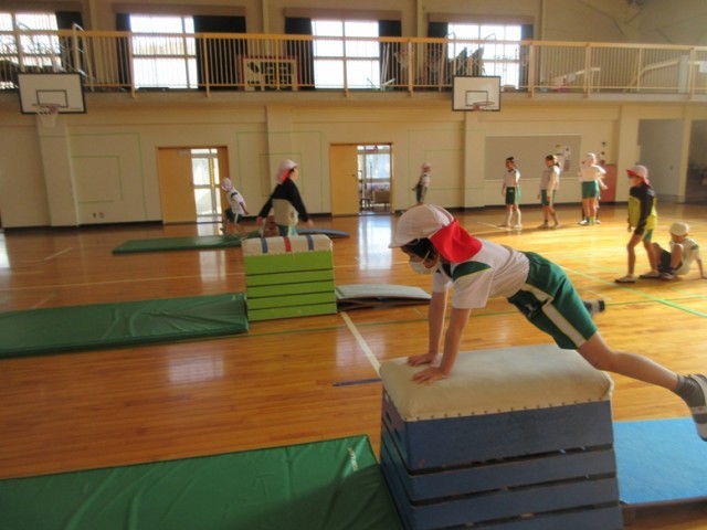 2組は、体育「跳び箱運動」です。開脚跳びや閉脚跳びにチャレンジしています。怖がらずに、手をつく位置や踏切の強さを意識して跳べたかな?
