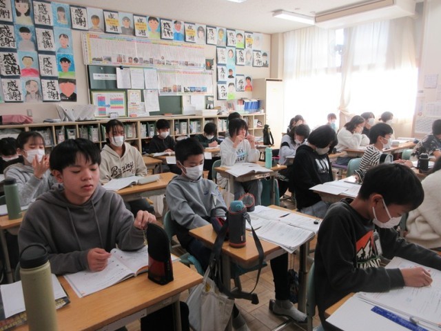 6年1組は、算数「2つの量の変化」についての学習です。紙○枚の時の重さ□gの関係について考えています。
