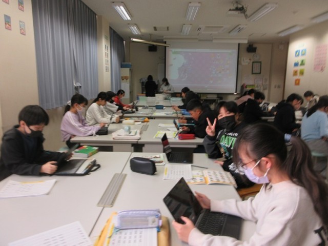 2組は、英語の学習です。1時間の最後の確認にカフートを使って、楽しく各国の言葉について振り返っていました。