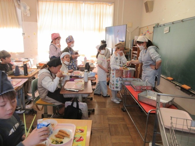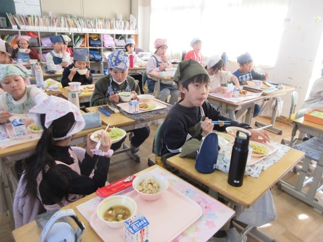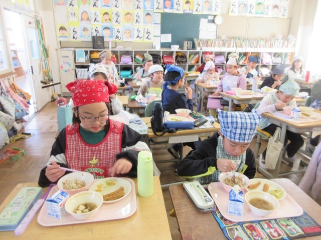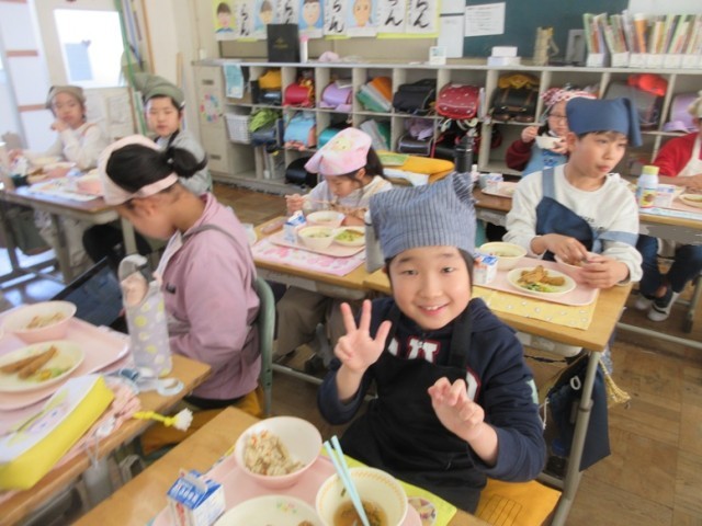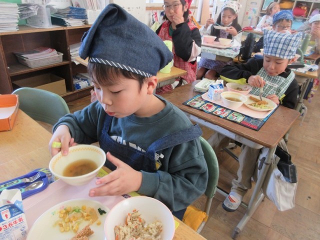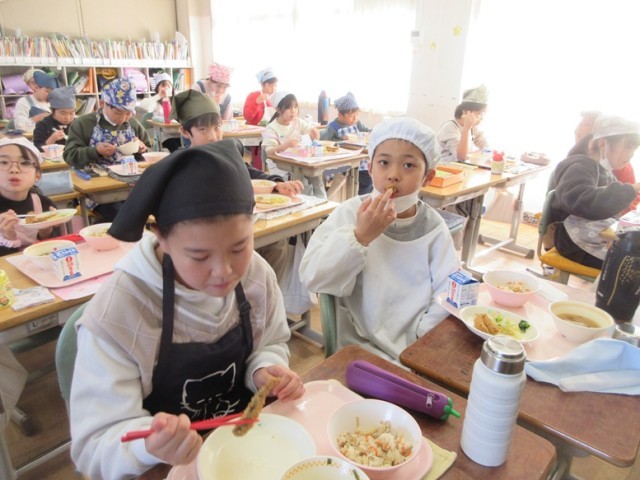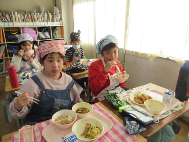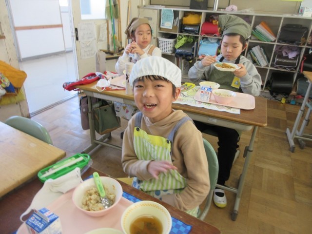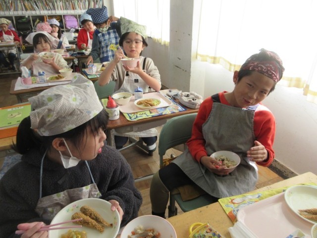 4年2組もカリカリ鰯をおいしそうに食べています。今日の魚は、ししゃもじゃないからね。