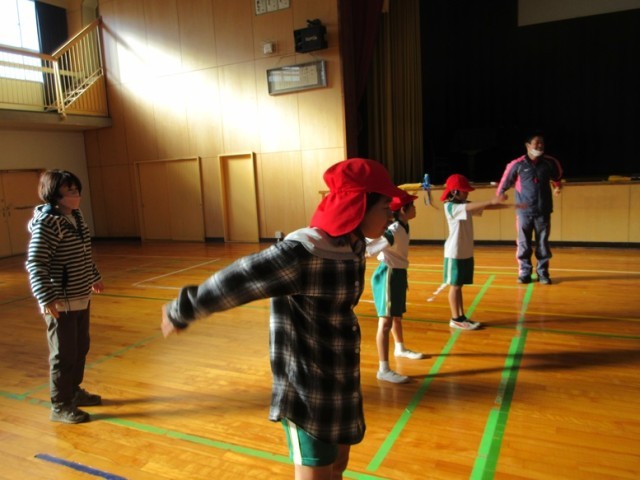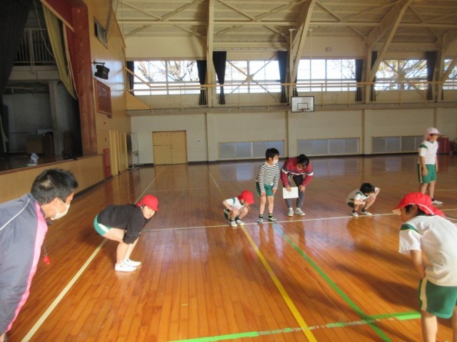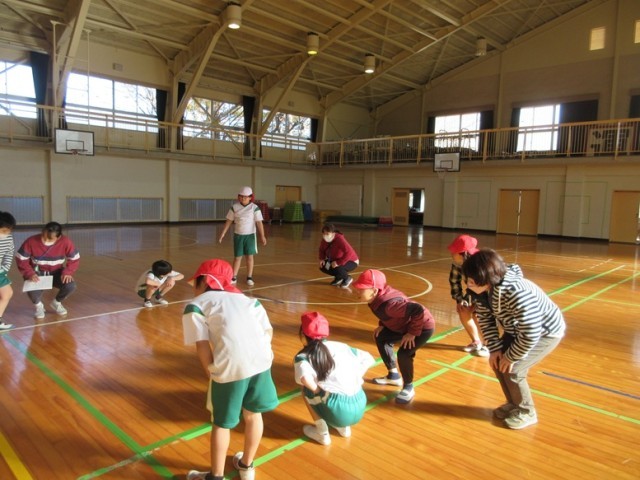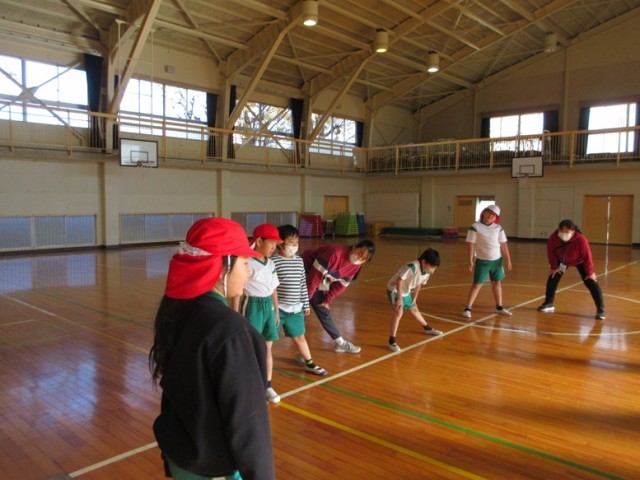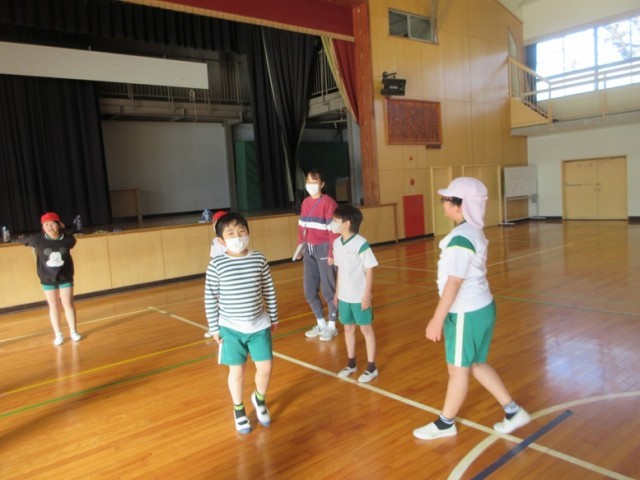 7組は、1,2組とも体育館で体育です。はじめに準備体操をしっかり行います。「伸脚!深く!1,2,3,4」の後、「ジャンプ!深く!」と。「え?え?どうやるの?」と思わずみんなほっこり笑顔になりました。