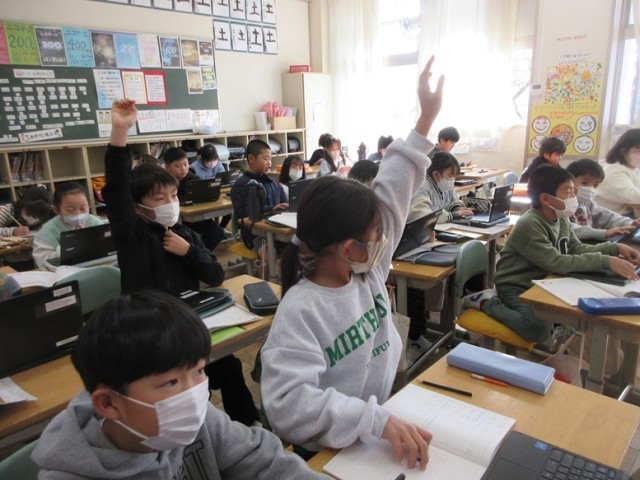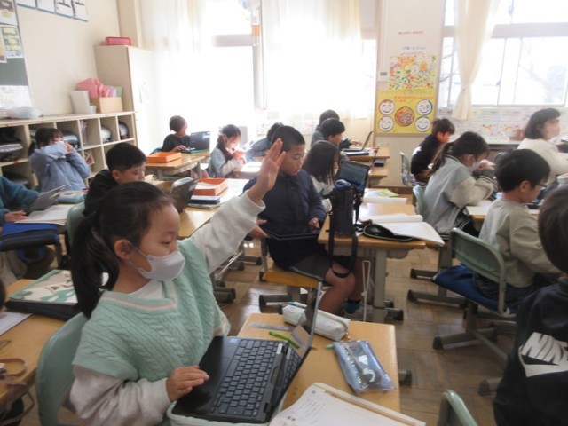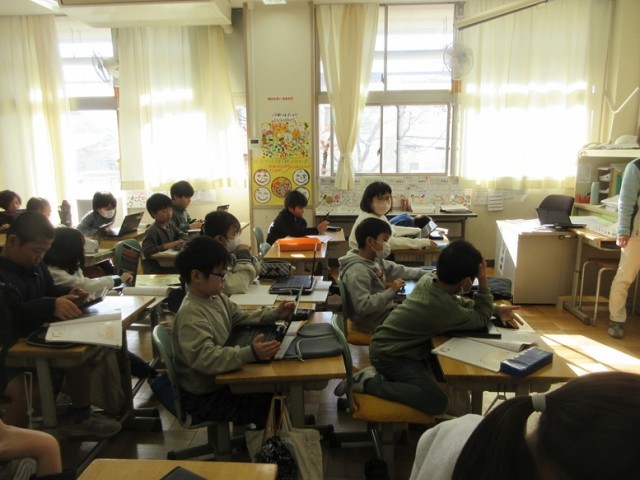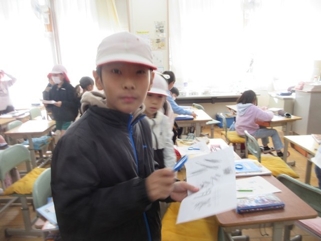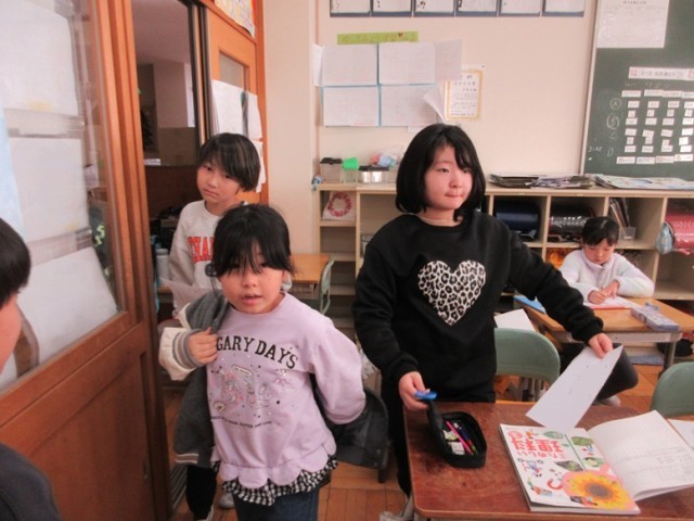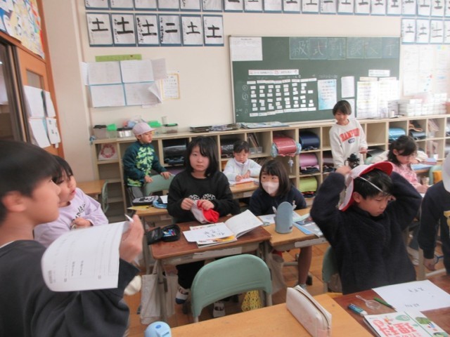 2組は、理科で虫眼鏡を使って胎教の光を集める実験のため、外に出て行きました。冬場は火事が多いので、家でやるときは必ず大人の前でやるようにしましょう。約束してほしいと思います。