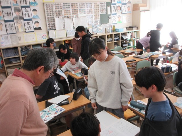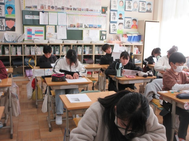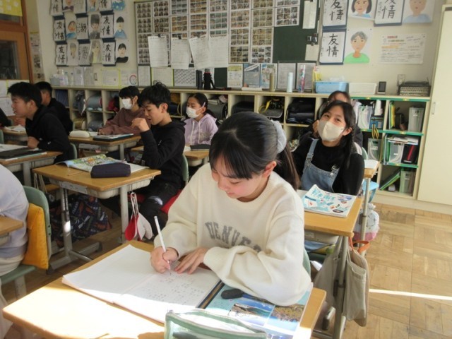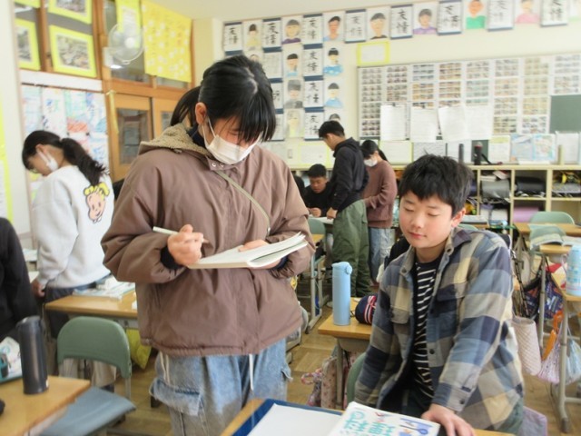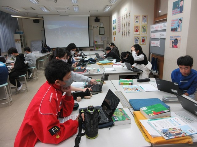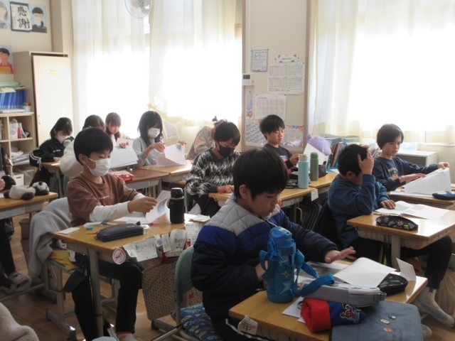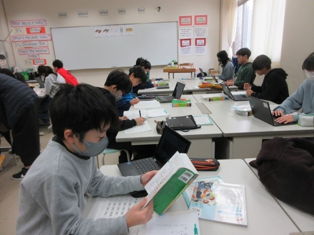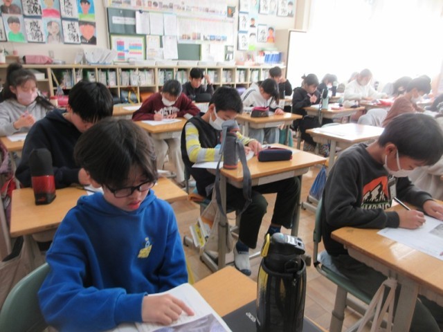 6年1組は、国語「海のいのち」の学習です。範読音源データを聞きながら、形式段落、意味の分からない言葉、重要だと思うところなどを書き込んでいます。