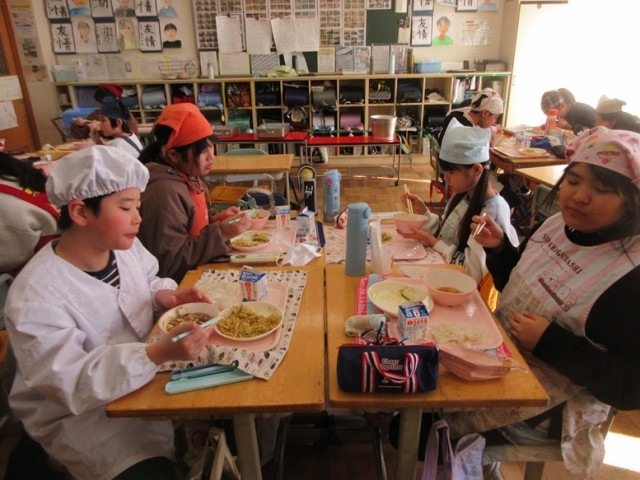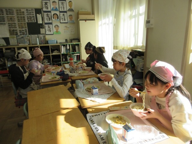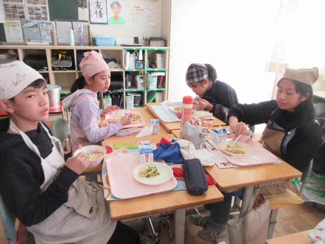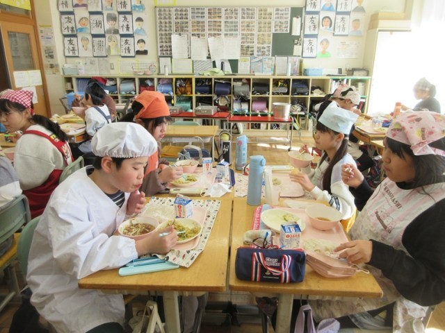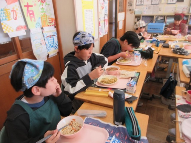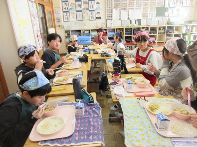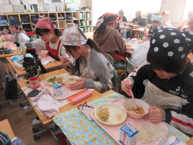 6年2組もかき揚げうどんをおいしそうに食べています。さすが6年生は配膳の時間はスムーズです。