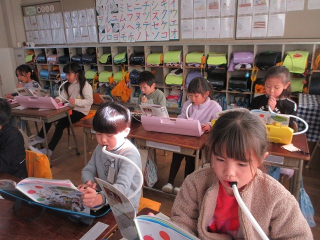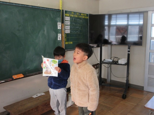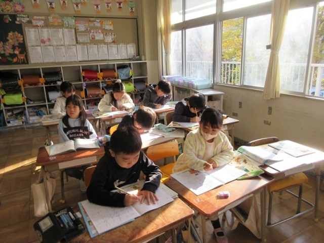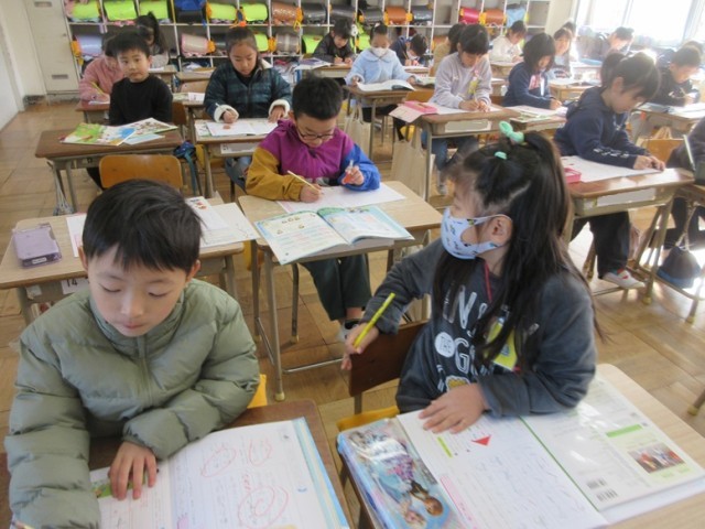 1年生は1,2組とも音楽の授業です。1組では、「やまびこごっこ」の歌のテストです。教科書を見なくても元気よく歌える子もいます。思わず、「やまびこさ~ん♪」の後に「やまびこさ~ん♪」と歌い返したくなりました。