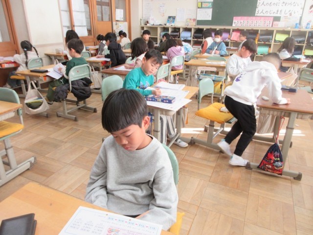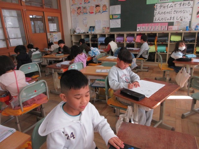 2年1組は、算数「かけ算」のテストです。みんな、集中して取り組んでいます。九九はバッチリですか?