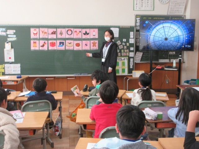 2組は、英語の学習です。クリスマスにまつわるものなどについて、英語で確認し、ALTの先生の後に続いて楽しくリピートしています。