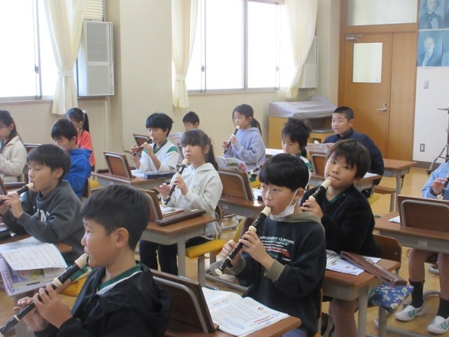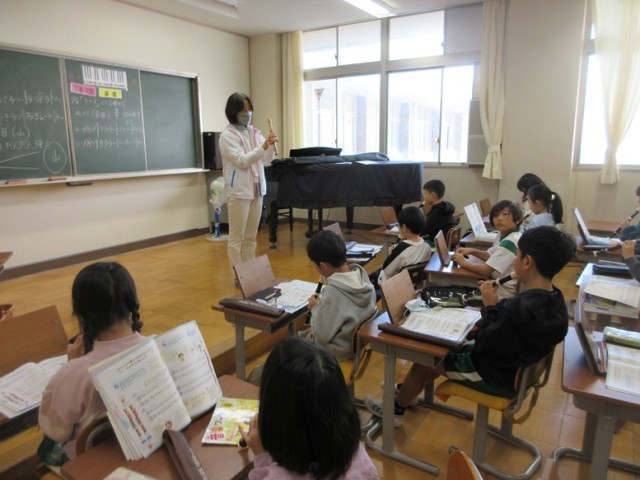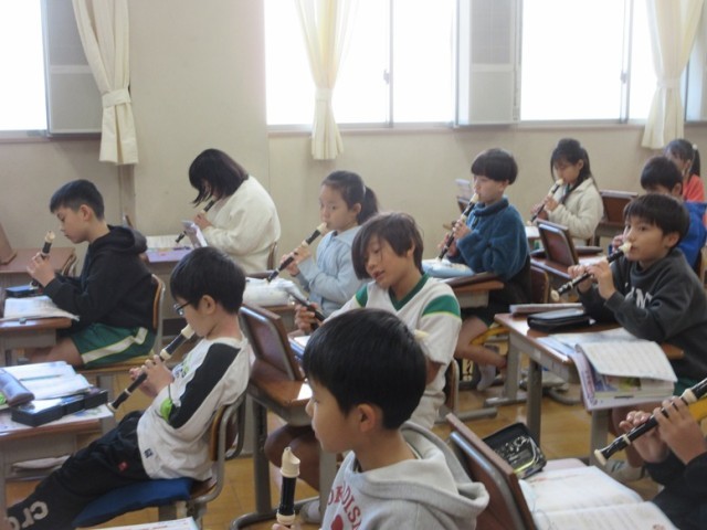 3年1組は、音楽「メリーさんの羊」の学習です。リコーダーで指使いを確認して演奏の練習をしています。