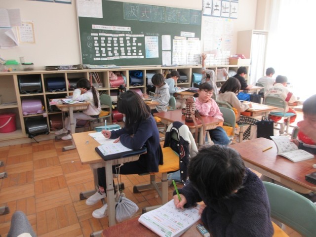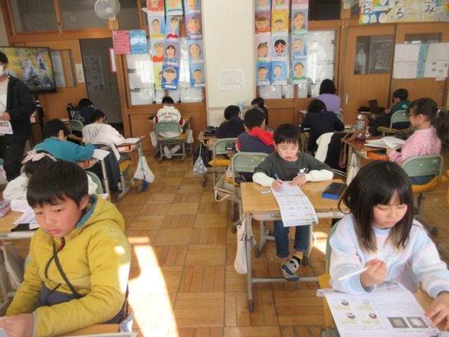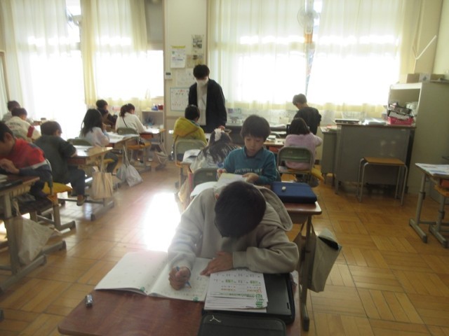 2組は、理科「地面の様子と太陽」のテストです。この前、虫眼鏡をもって外で実験したことは、テストに出ていたかな?