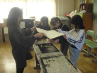 4年1組は、図工「木版画」の学習です。まずは、動画を見ながら彫刻王の種類とそれぞれの特徴について確認しました。また、全体に刃の方向に指を置かないと、安全上の注意点を確認しました。動画を見ながら「サクサク彫ってて気持ちよさそう」という感想もありました。