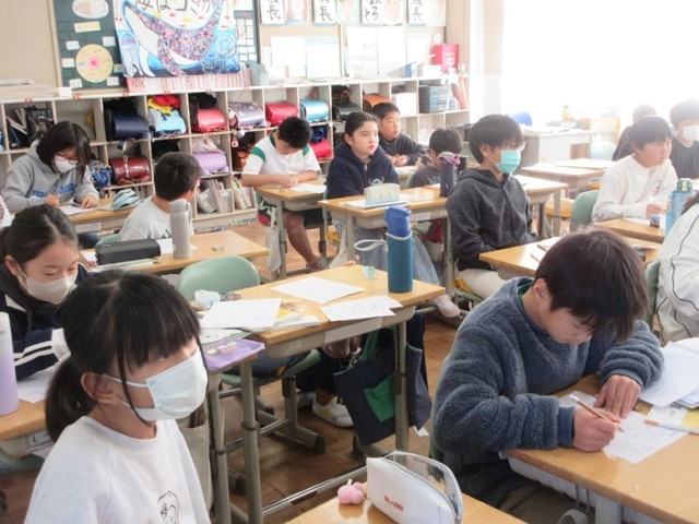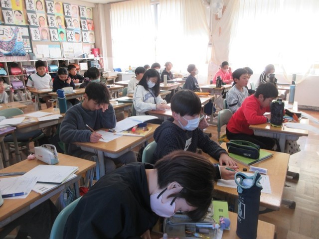 5年1組は、算数「平行四辺形、三角形の面積」の学習です。三角形の面積について、底辺と高さとの関係に着目して考えていました。