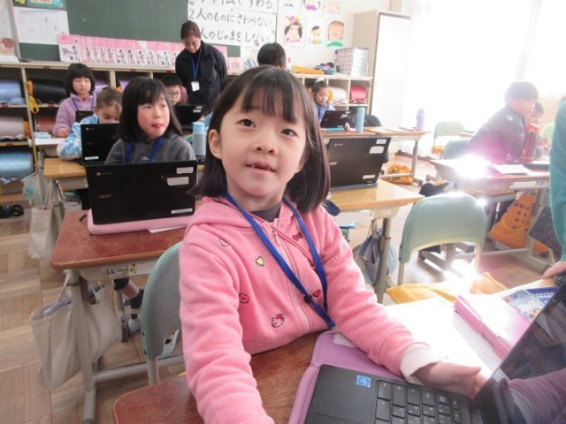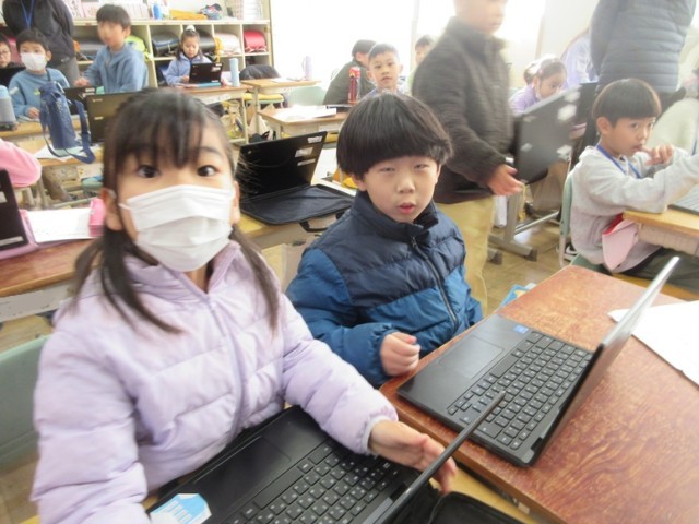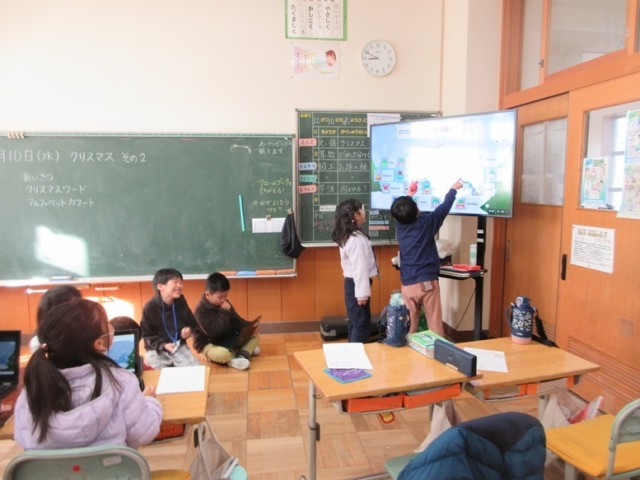 2年1組は、英語の学習です。カフートに自分の名前をローマ字打ちし、好きなアイコンを作っています。「ぼくのはこれだよ!」と大画面を指さしている子もいます。問題は、クリスマスについてです。しっかり答えられたかな?