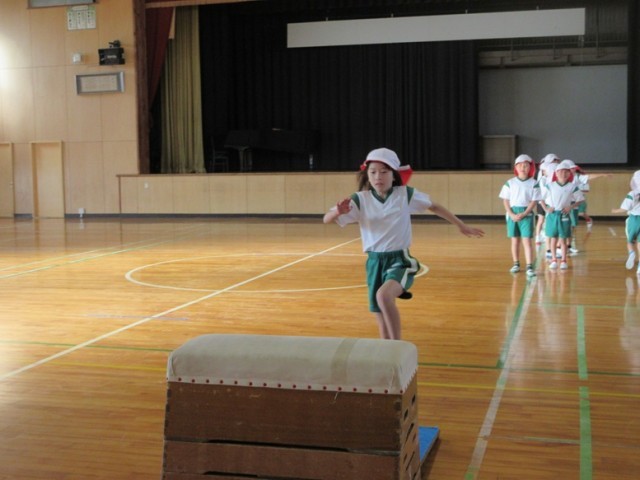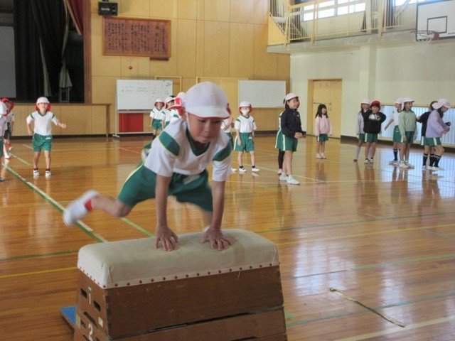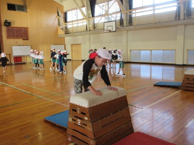 2組は、体育館で「跳び箱運動」です。先生から、手をつく位置や次の人との合図することなどを聞いた後、さっそくチャレンジしていました。跳べるようになったら、どうやったらきれいに跳べるかを考えてチャレンジするのもいいかもしれませんね。