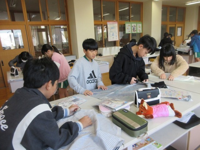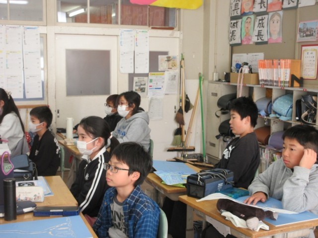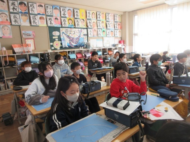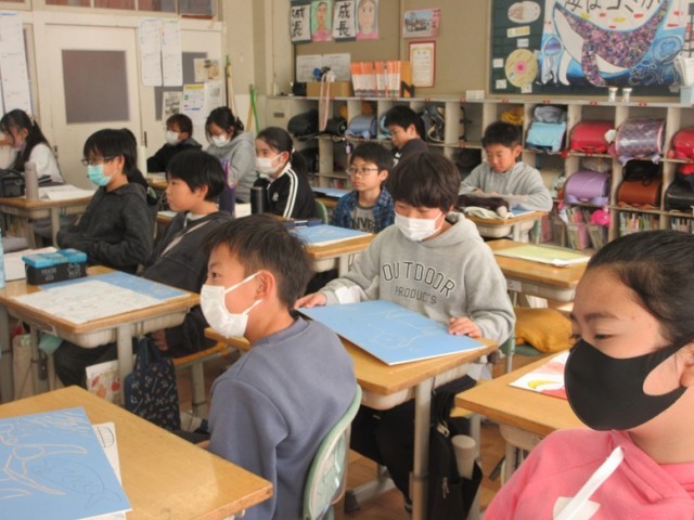 5年1組は図工で、一版多色刷りの学習です。先生からすり方の説明を聞いています。黒い画用紙にどんな色が重なっていくか楽しみですね。