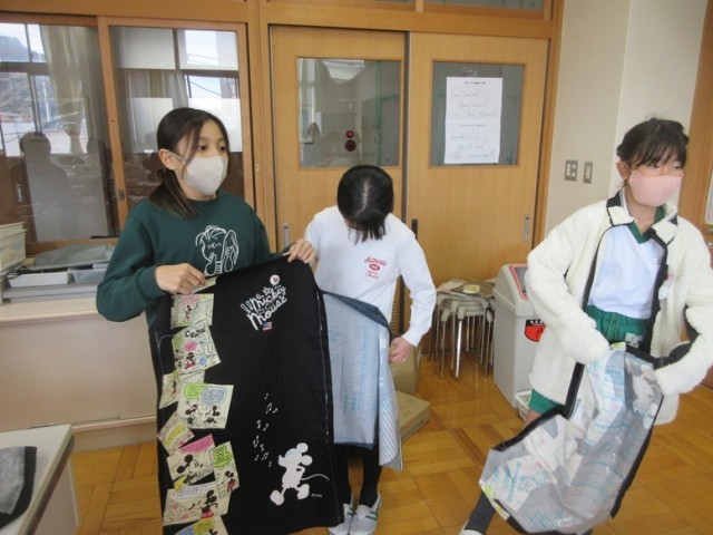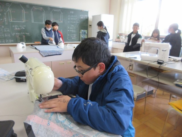 2組は、家庭科「エプロン作り」の学習です。アイロンをかけたり、ミシンを使ったりしながら進めていきます。ミシンを扱う表情は真剣そのものです。