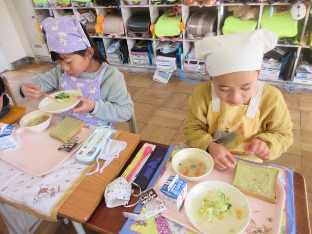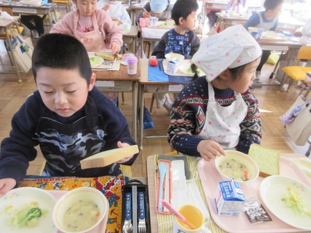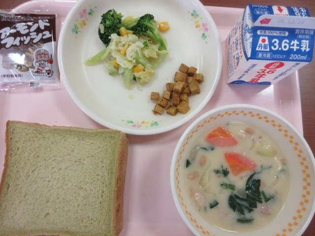 今日の献立は、緑茶パン、白インゲンの豆乳シチュー、カリフローレと野菜のソテー、アーモンド小魚(見本の写真には、余った食パンの耳で作ったクルトンの試昨が写っています。子供たちの給食には含まれません)