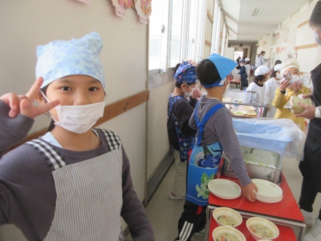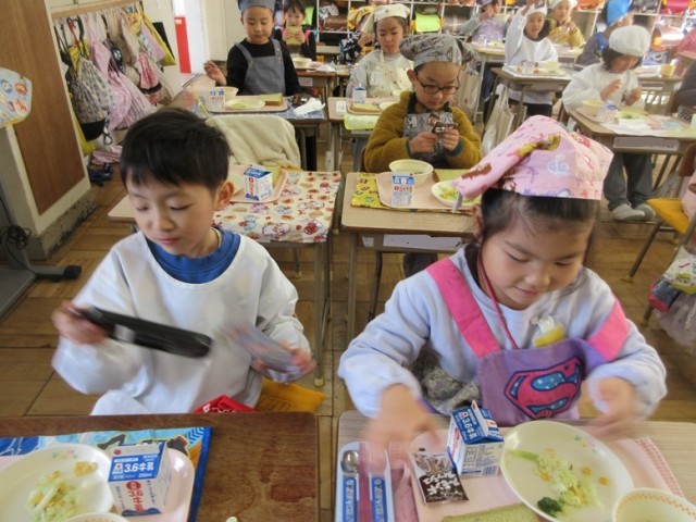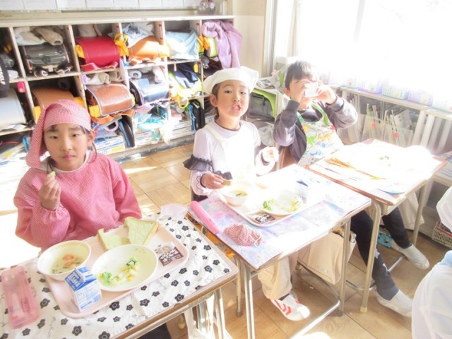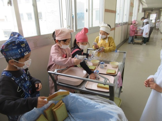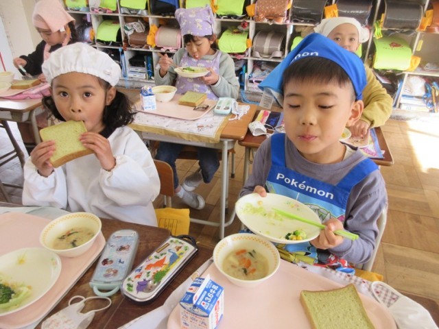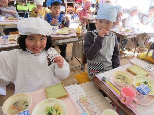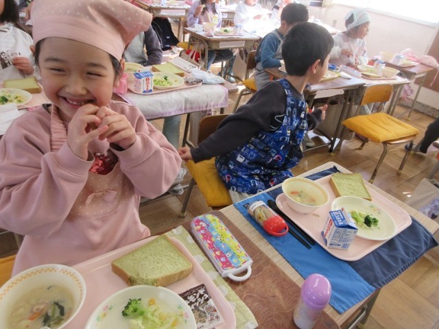 1年1組の子たちは、配膳もがんばって、上手になってきました。緑茶パンは、お茶の緑色の食パンでほんのりお茶の香りがします。沼津産のカリフローレも残すことなく食べられましたか?