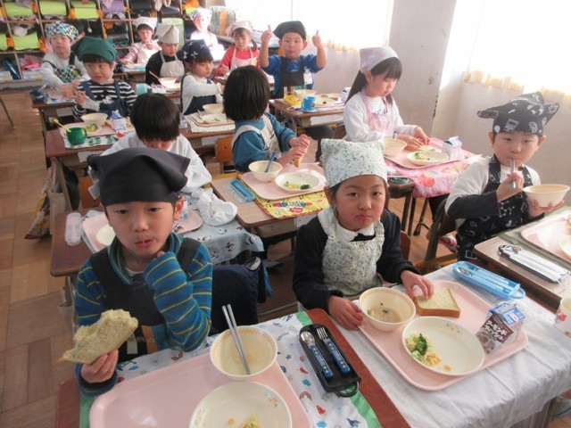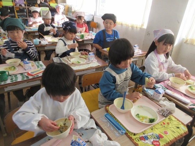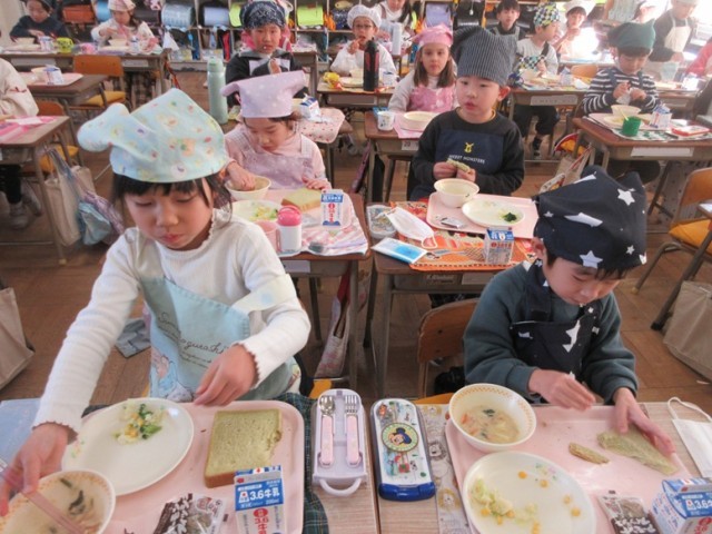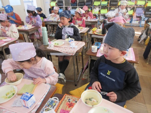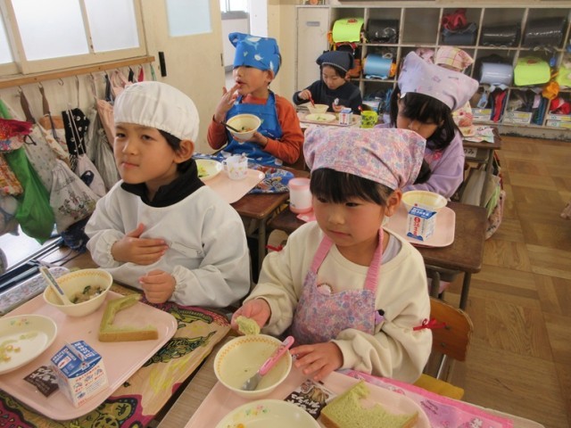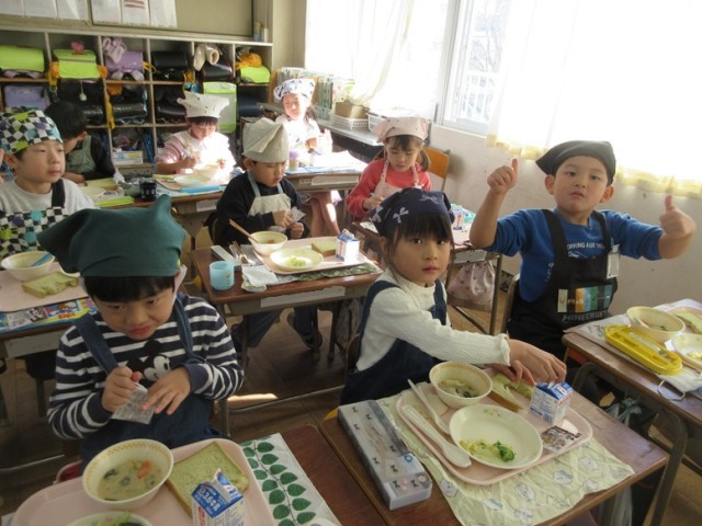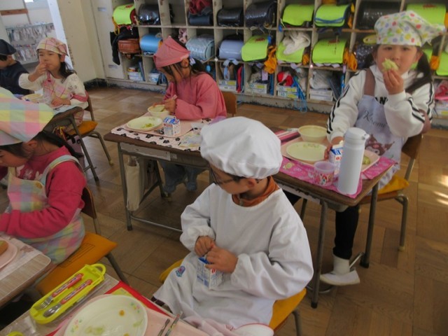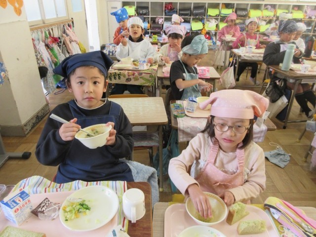2組もおいしそうに給食を食べています。パンをシチューにつけて食べる子、先にアーモンドフィッシュをおいしそうに食べる子などなど、楽しい給食の時間を過ごしています。