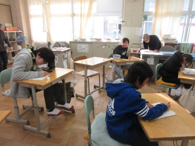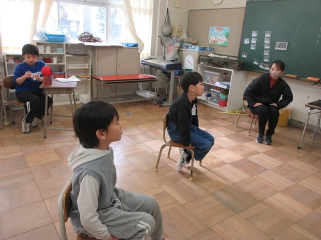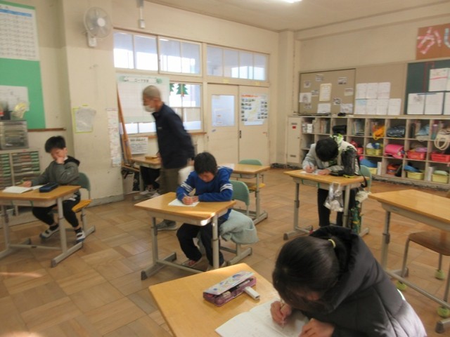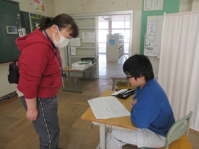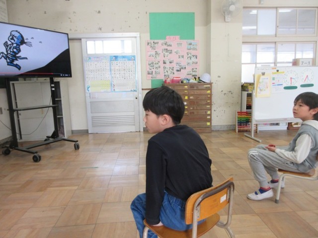 2組は、国語のプリント、国語「モチモチの木」を学習する子と学年に分かれて学習しています。モチモチの木は、豆太が足をけがしながらも夜の道を走ったのはなぜかということをみんなで考えていました。「おじいさんが死んじゃう方が怖いんだよ」など素直な意見が出ています。