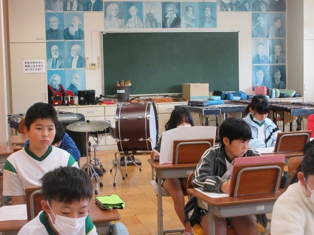 5年1組は、音楽「待ちぼうけ」の学習です。曲を聴いて感じたことや思ったことを発表しています。「物語のようになってるみたい」「国語の大造じいさんとがんのように、繰り返している」「どれも4行」などなどいろんな意見が出されました。