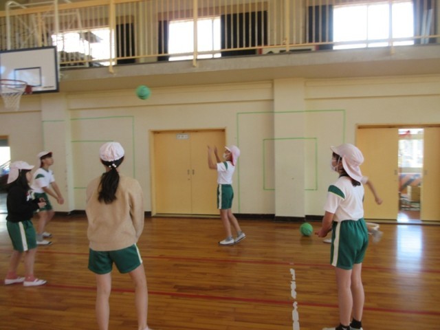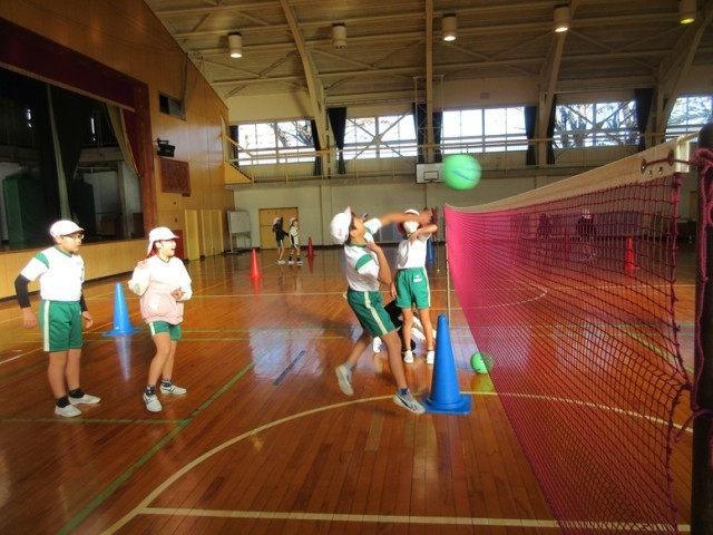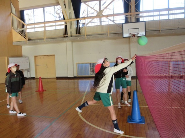 2組は、体育館で「ソフトバレーボール」の学習です。チームで、パス練習やスパイクの練習をしています。楽しく体を動かしています。