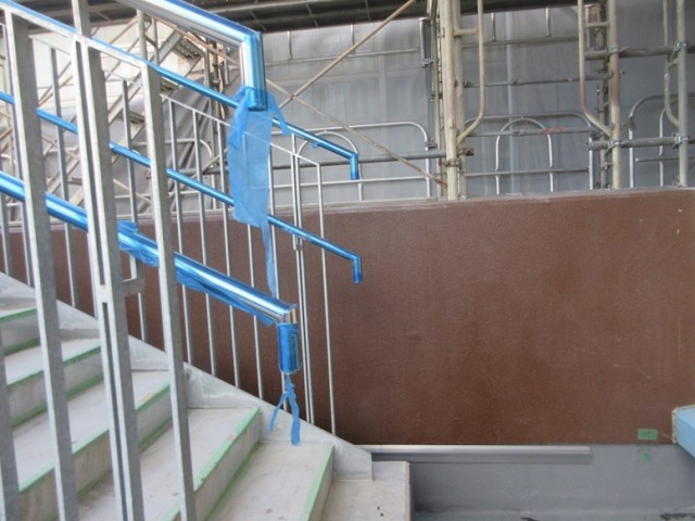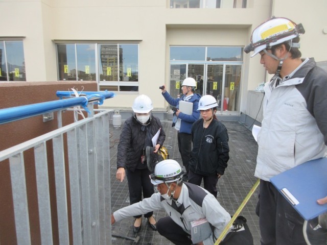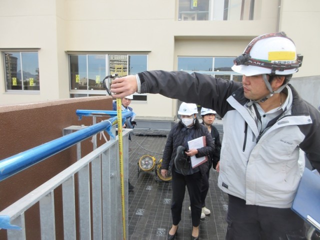 活動テラスの壁の高さや手すりの高さを確認しています。子供たちにも正しい使い方やルールを守るようにしてもらいたいと思います。
